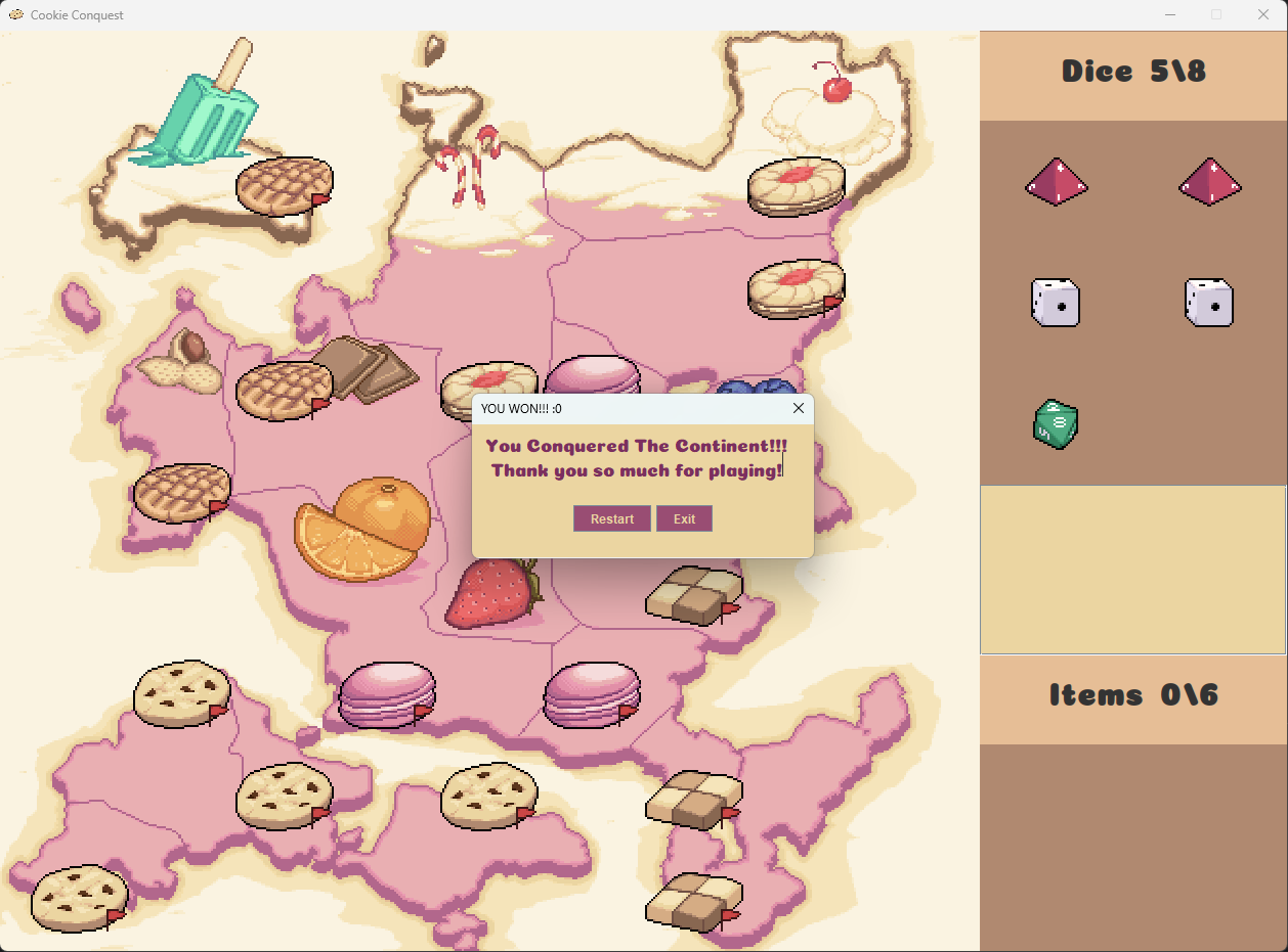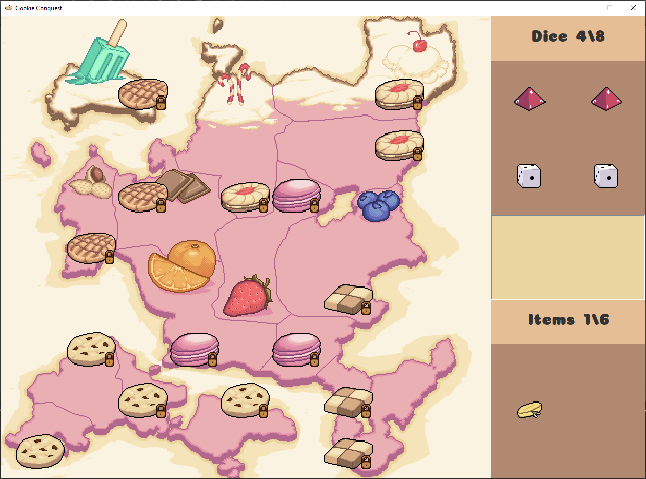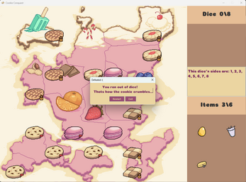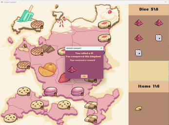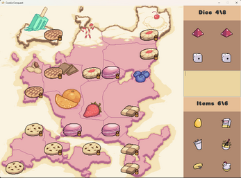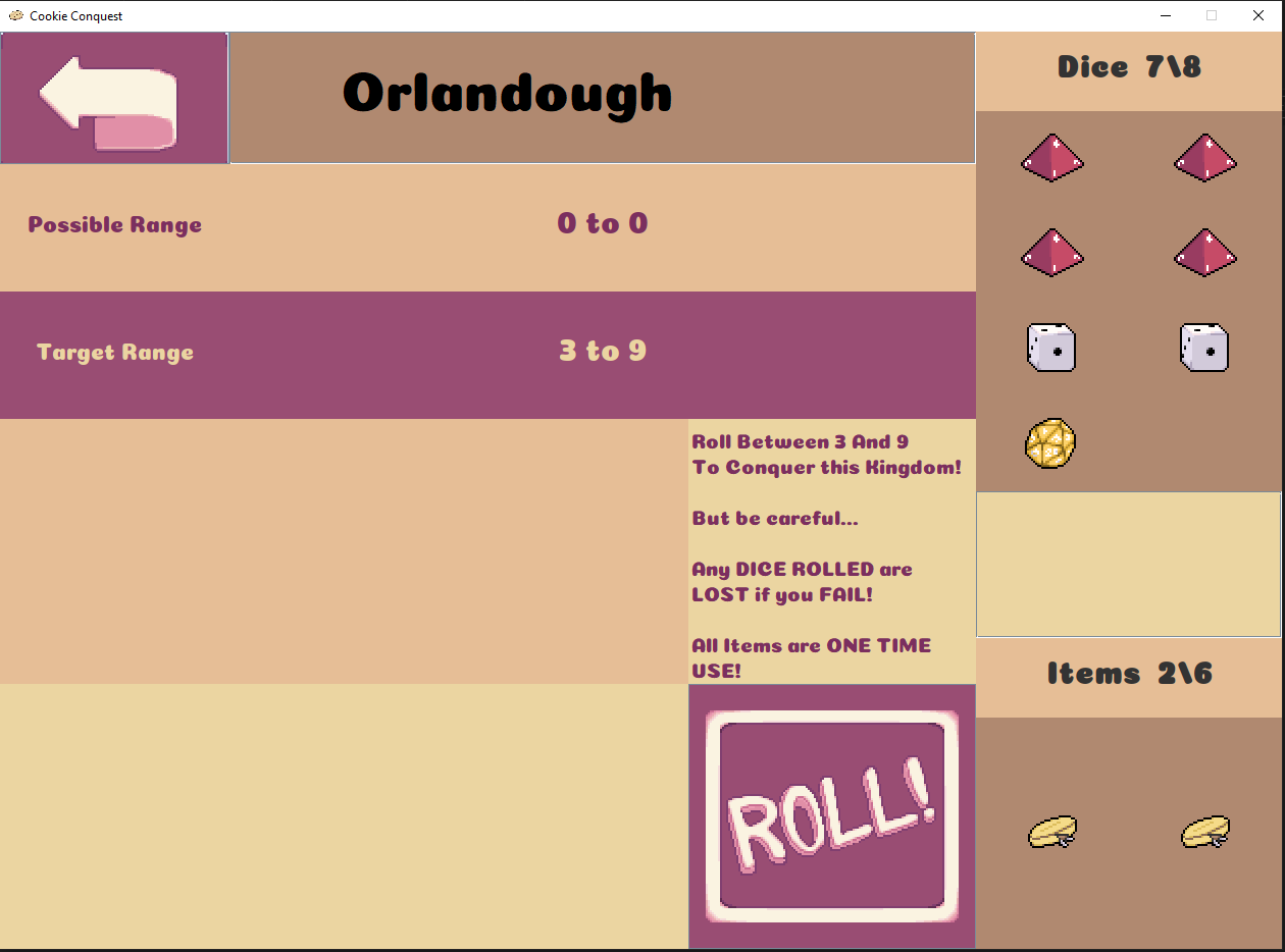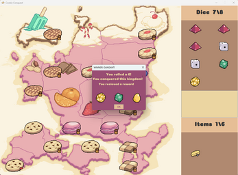 Gamble your heart away on a quest to Conquer the Cookie Kingdom! Roll dice between a specified range to conquer the many Capitals of the Cookie Kingdom, be careful, if you miss, you will lose that which you have wagered. if you run out, its over.